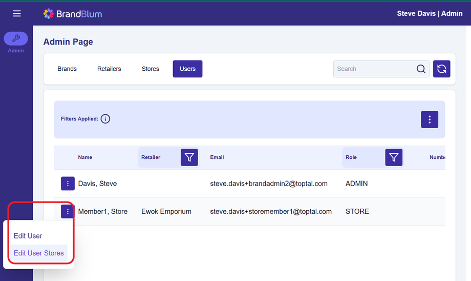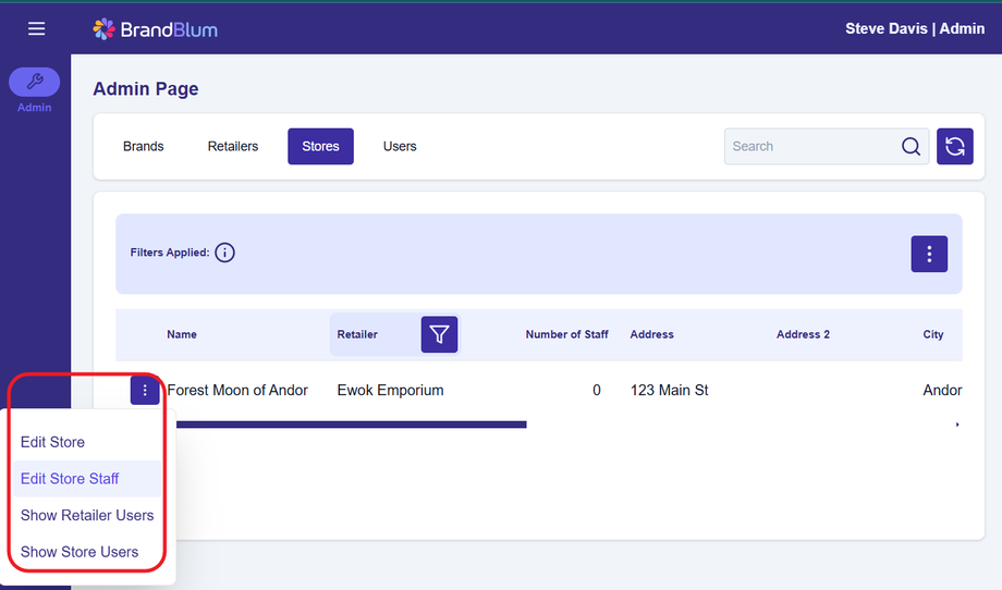 When you find the Store, go to the Line Action button (on the left of the Store name) and select Edit Store Staff.