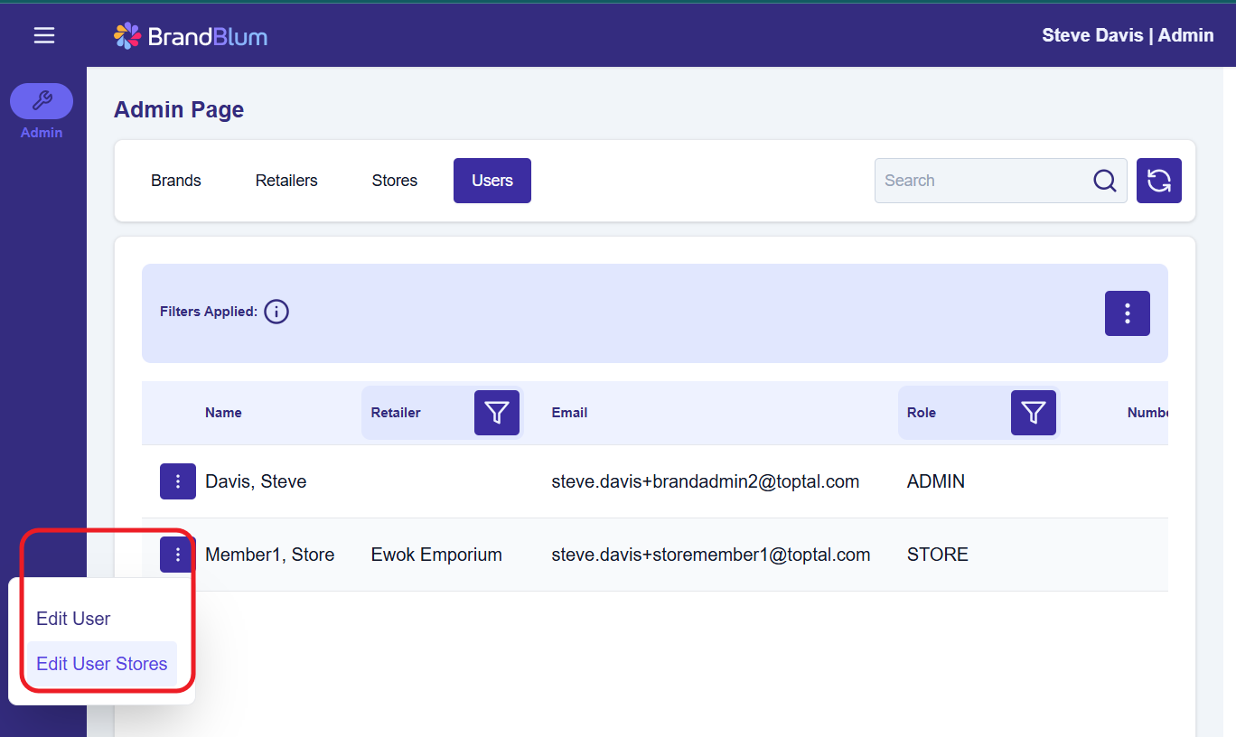 When you find the User, go to the Line Action button (on the left of the User name) and select Edit User Stores.