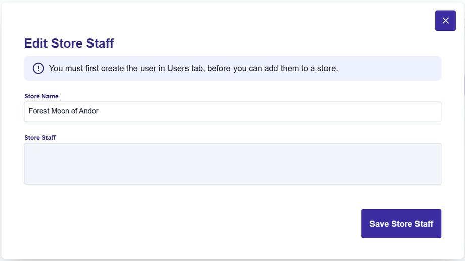 Click inside the Store Staff box and select the Users that you want to add to the Store. You can add multiple store users to the Store.