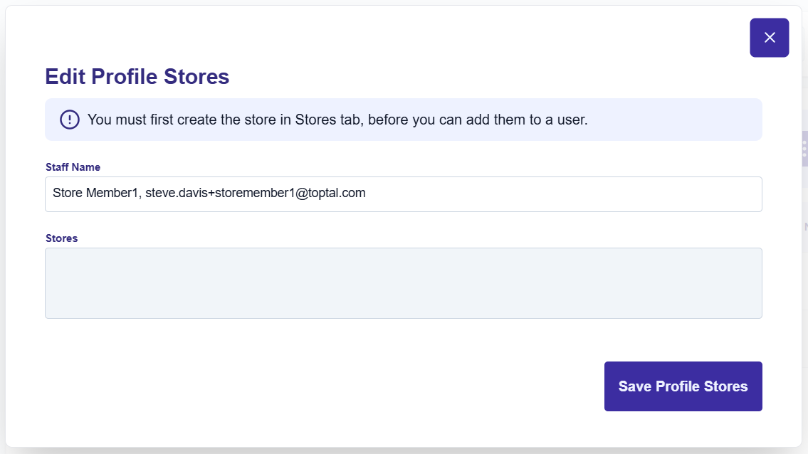 Click inside the Stores box and select the Stores that you want the User to be associated with. You can add multiple Stores to the User. When finished, click the Save Profile Stores button.