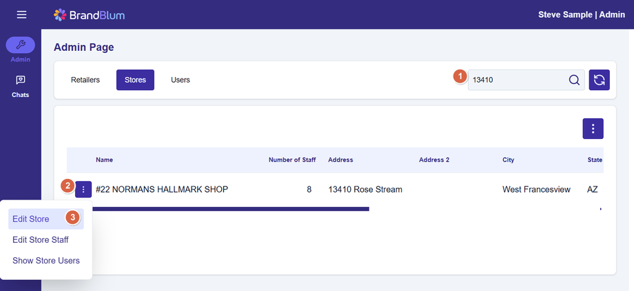 Need to edit a Store? First, find the Store in the list. You may need use the Search (1) box (above the columns) to search. Once you find the store, click the Line Action button (2) to the left of the store name, and select Edit Store (3). (Screenshot shows the Retailer Admin page, for reference)