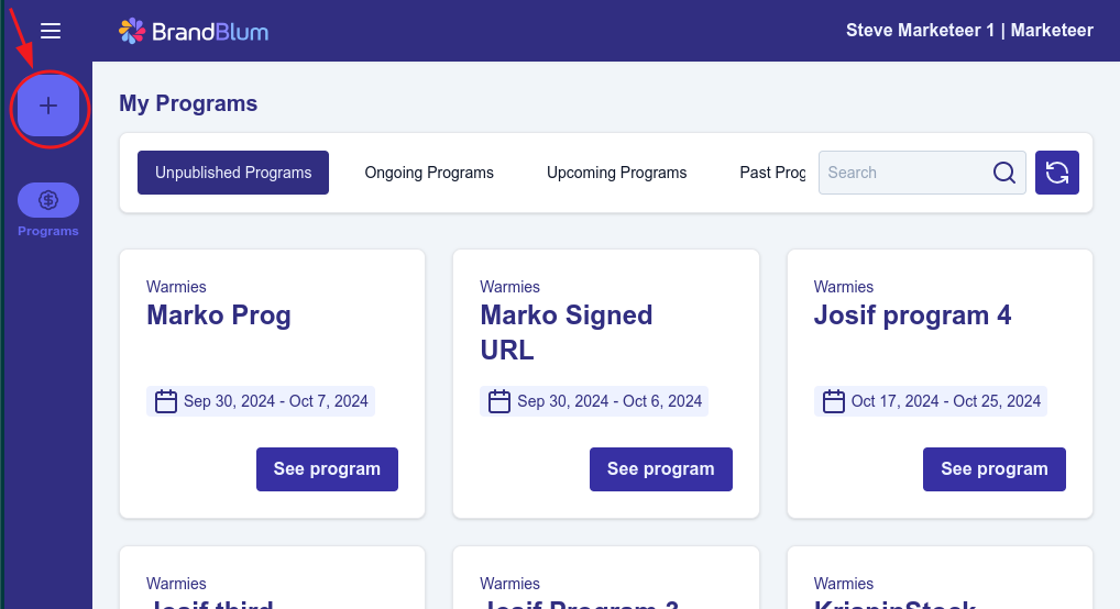 Once in BrandBlum, you'll be taken to the My Programs screen, where you'll click the "Add Program" button (the "+" button shown circled in red).