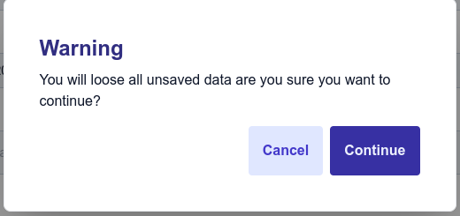 Click the Continue button to continue without saving your changes, or click Cancel to close this warning so you can go back to click the Save (or Save & Publish) button to save your work.