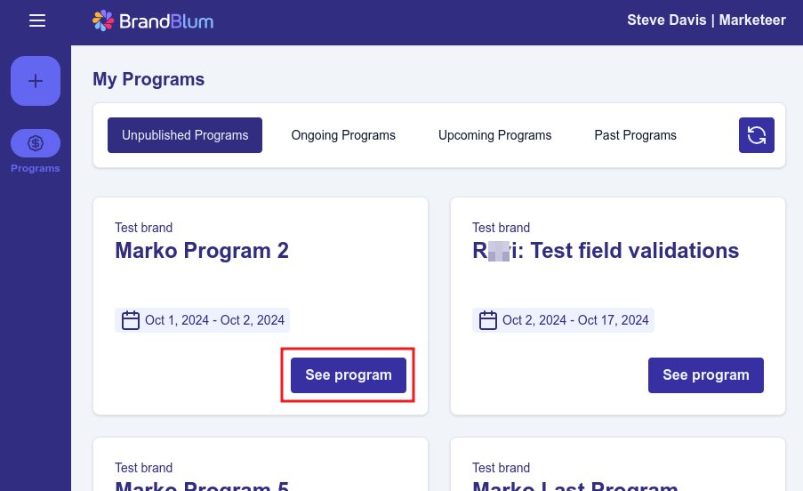 - Unpublished Programs - programs that haven't been published. These are "inactive" and only visible to the Brand Marketer